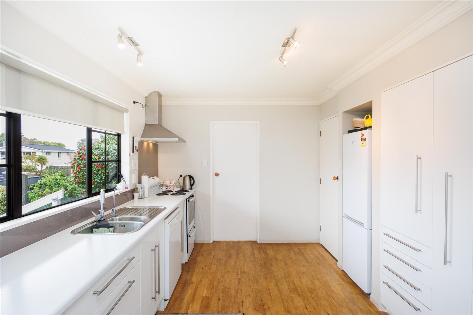 Brilliant bench and pantry space in the white-sleek modern kitchen which is adjacent to the spacious separate laundry area that has room for freezer space too.