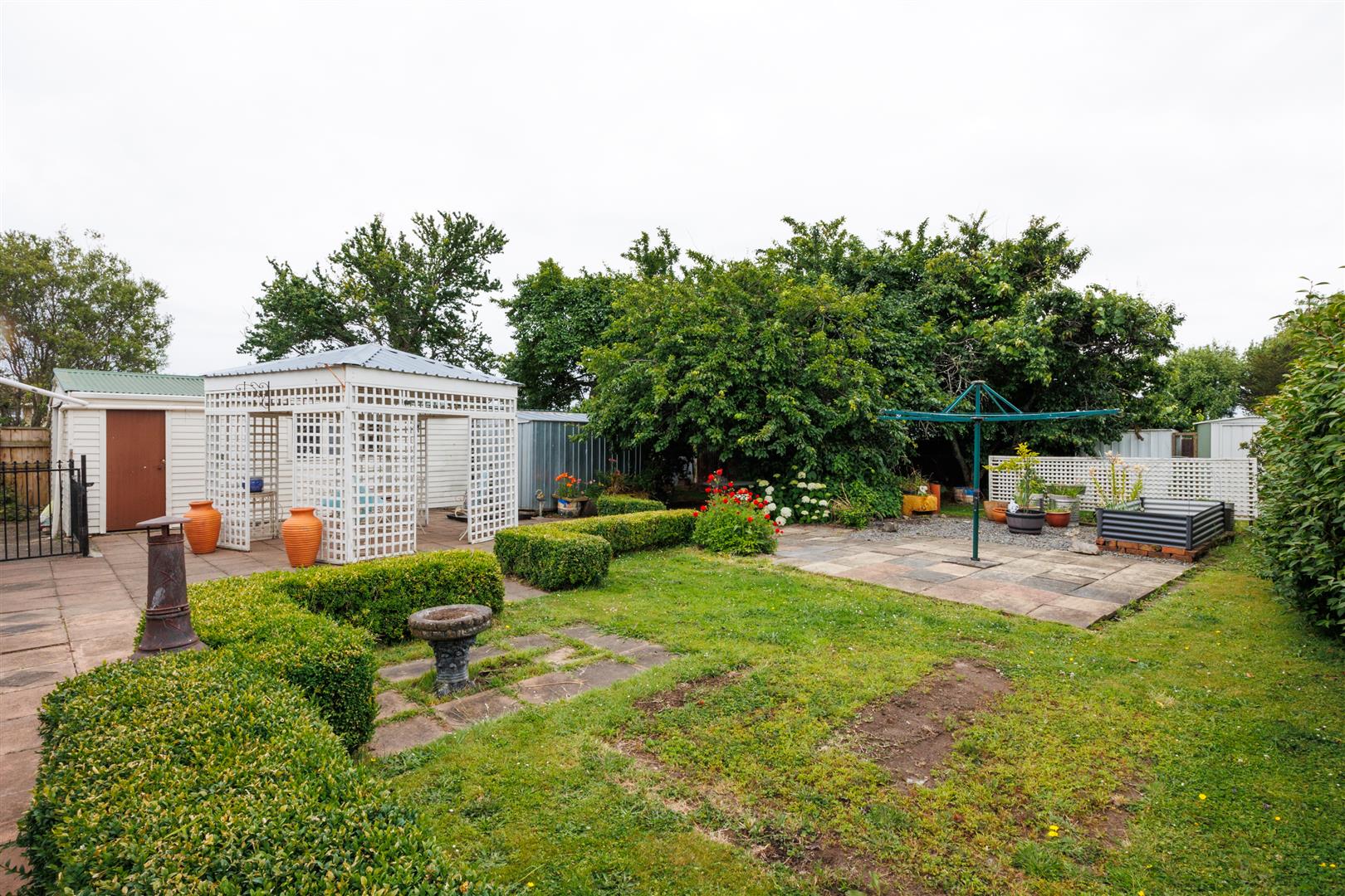 Well established fruit trees, raised vegetable plots, and room to play. The three garden sheds are ideal for storing wood or garden tools. It's very private out back, and landscaped with an all-weather paved area. Wonderful relaxation under the big gazebo, out of the burning sun, is very welcome. Well maintained property, tandem garage and big old shed for extra firewood storage.