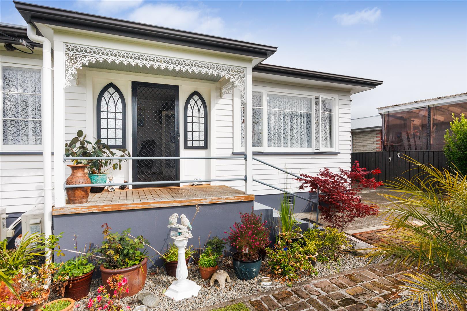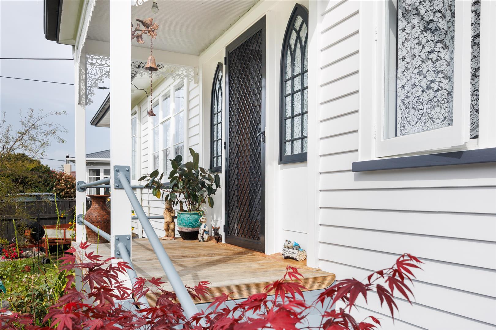 Intricate filigree makes a bold statement above the elevated and very welcoming gorgeous front entrance which is a good vantage point to view the stunning front gardens in the fenced front yard.